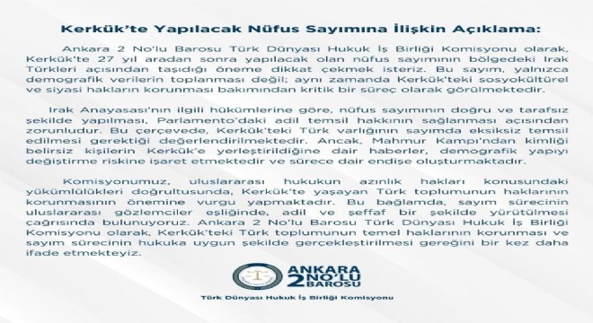 Ankara 2 No’lu Barosu, Kerkük’te yapılacak nüfus sayımına ilişkin, “Kerkük’teki Türk toplumunun temel haklarının korunması ve sayım sürecinin hukuka uygun şekilde gerçekleştirilmesi gereğini bir kez daha ifade etmekteyiz” açıklamasında bulundu.
