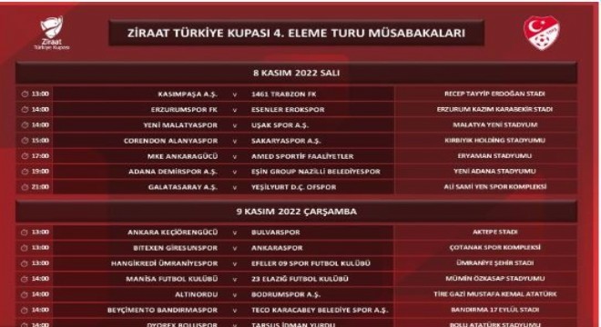 Ziraat Türkiye Kupası 4. Tur karşılaşmalarının programı Türkiye Futbol Federasyonu tarafından açıkladı. Galatasaray'ın 8 Kasım Salı günü Ofspor’u konuk edeceği karşılaşma saat 21.00'de oynanacak. Beşiktaş ise, 9 Kasım Çarşamba saat 21.00'de Serik Belediyespor ile Vodafone Park Stadyumu'nda karşı karşıya gelecek.